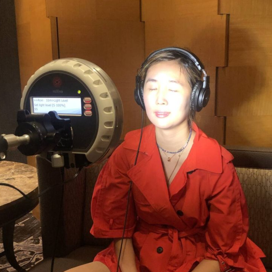 During a roXiva session, while sitting or lying down, the roXiva Light is placed at eye level, 8 to 12 inches from your forehead. A customized light sequence, duration, and music are selected for your session. As the light flickers, it creates specific brainwaves, automatically bringing you into a relaxed and meditative state, even if you are stressed or have a busy mind. Just observe your sensations during the session—no need to stop your thoughts.